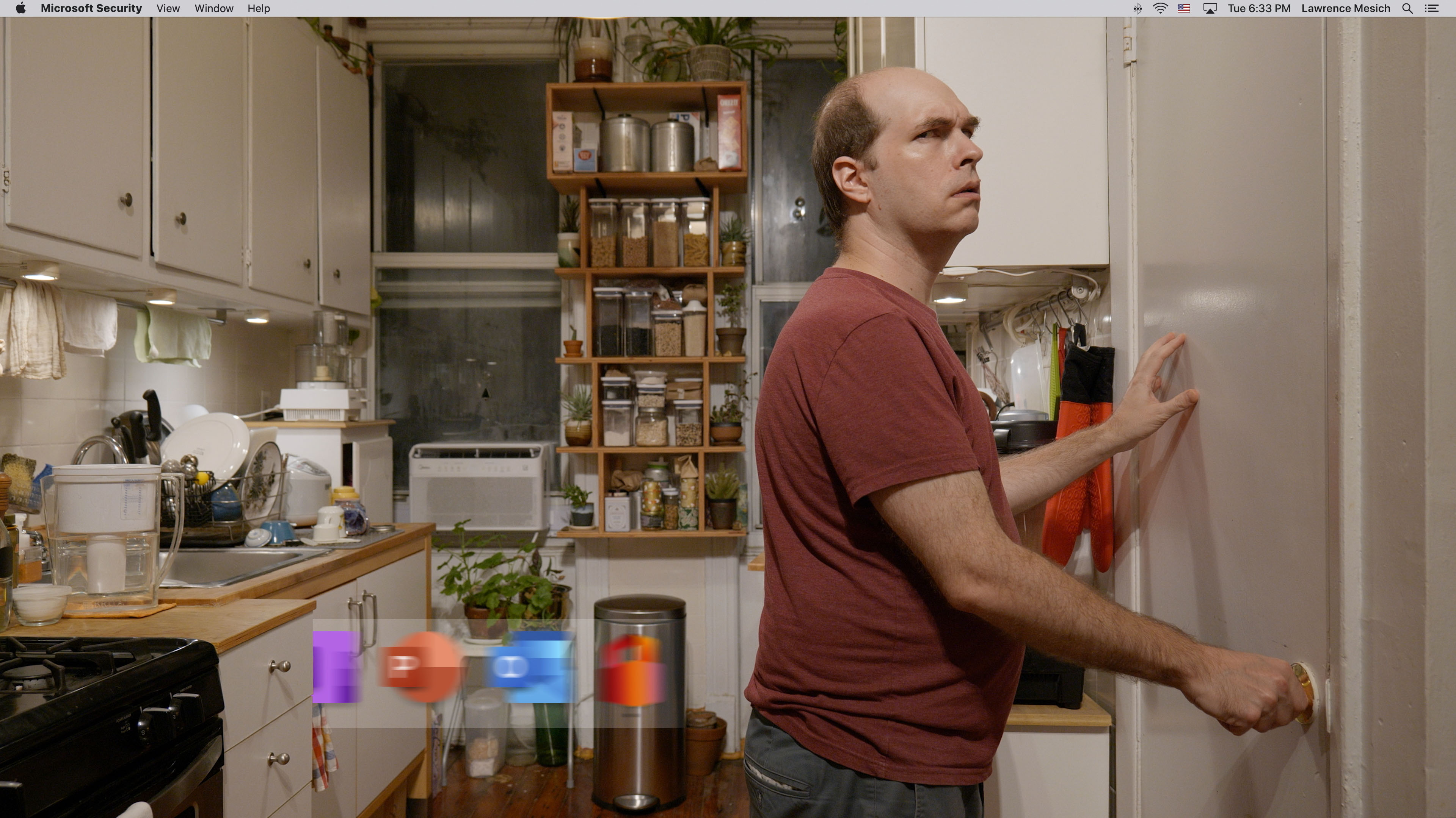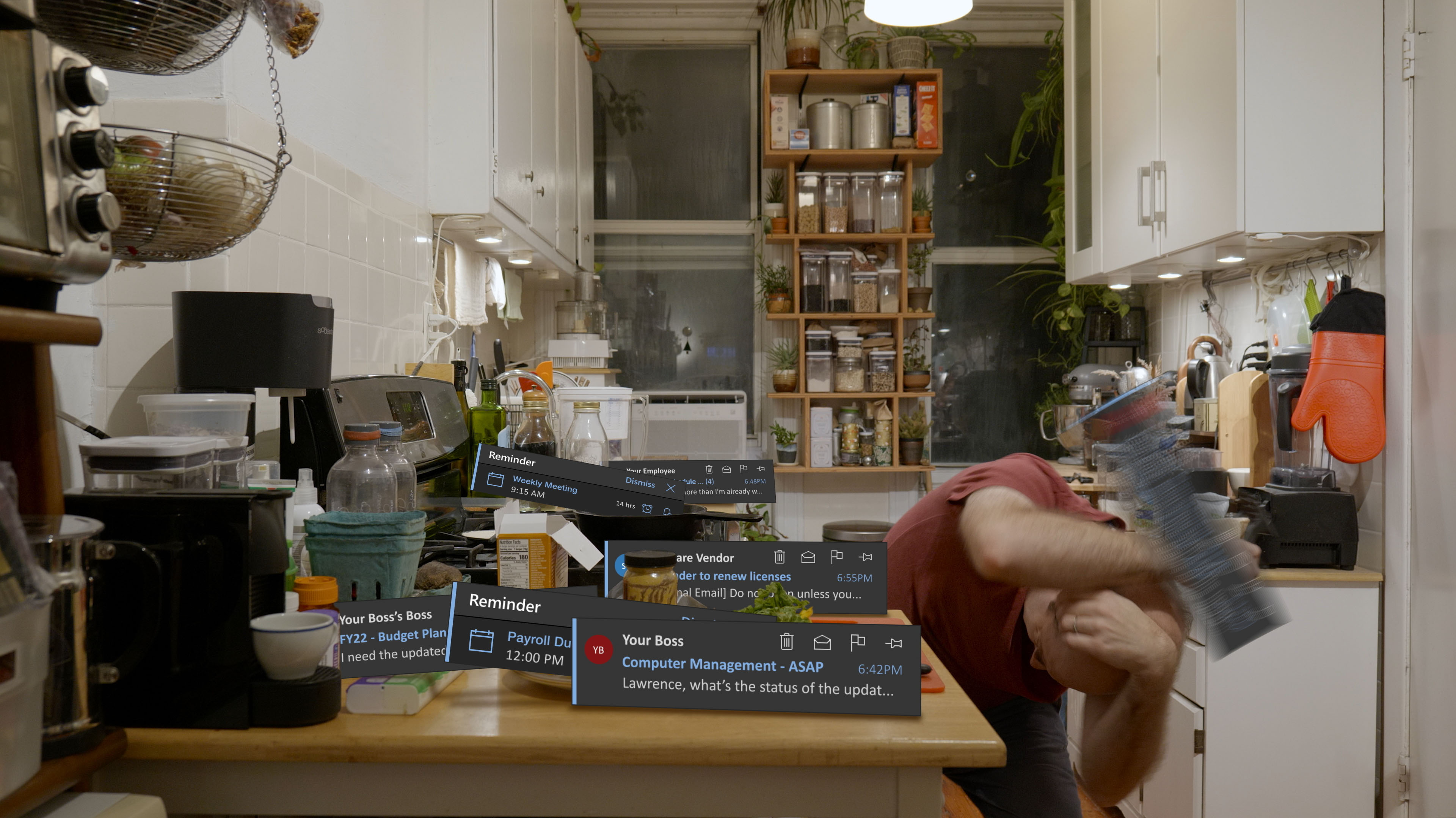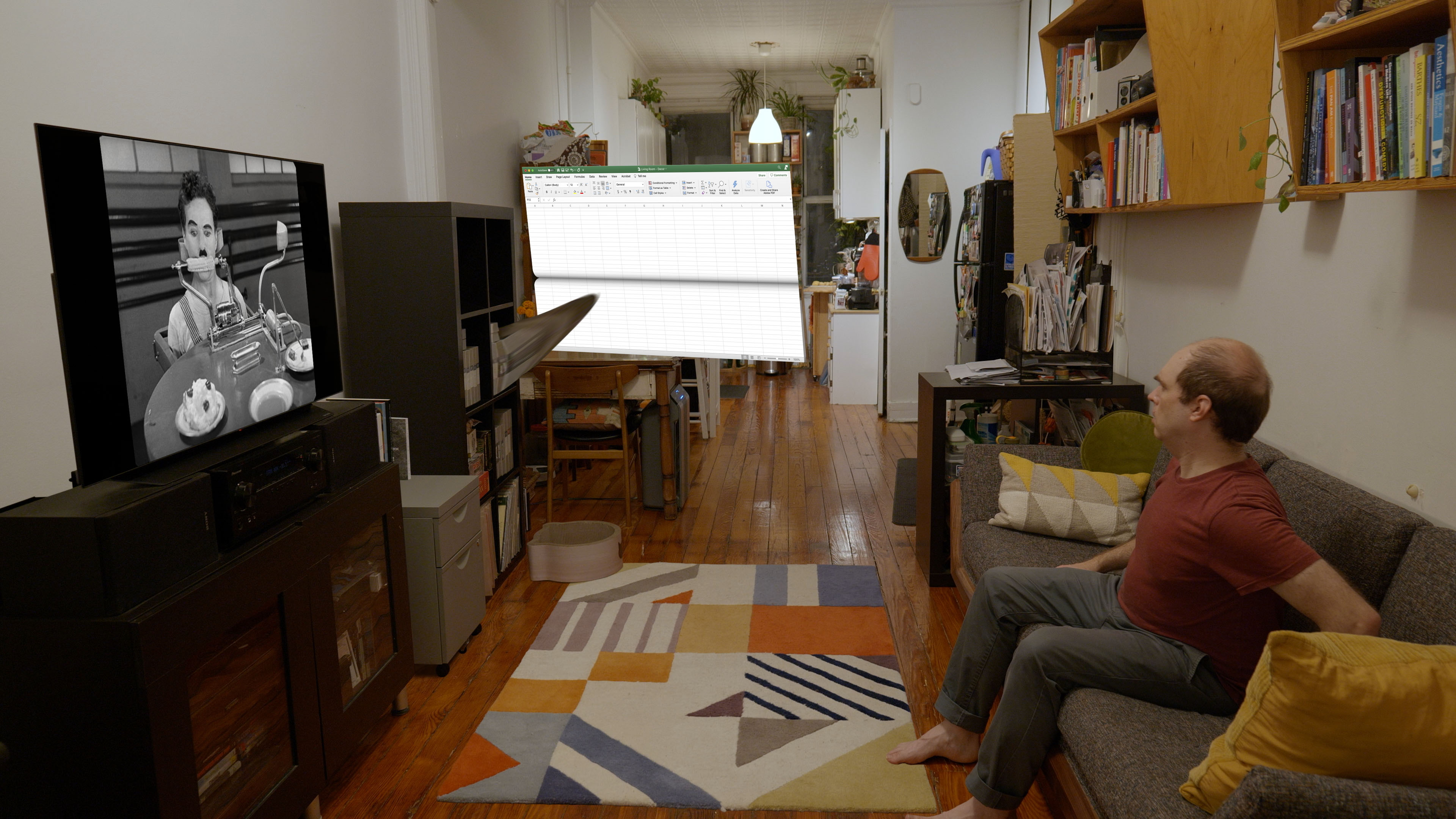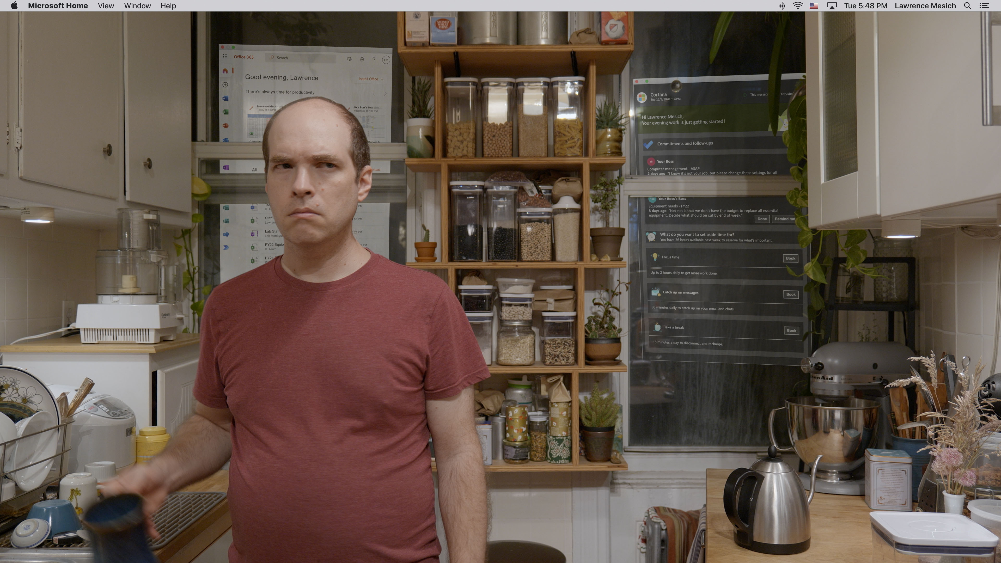 Description: MS-Office-WFH_v2020.18.1084.2.exe is a single-channel video which follows me as I navigate my real-world and digital routines simultaneously, with program GUIs inhabiting my apartment alongside me as autonomous objects. These works borrow from silent comedies, favoring gags and gesture over narrative, to depict the humor and horrors of living and working in our 24/7 attention-based economy during the necessary confinement during the shelter-in-place period of the ongoing global pandemic.